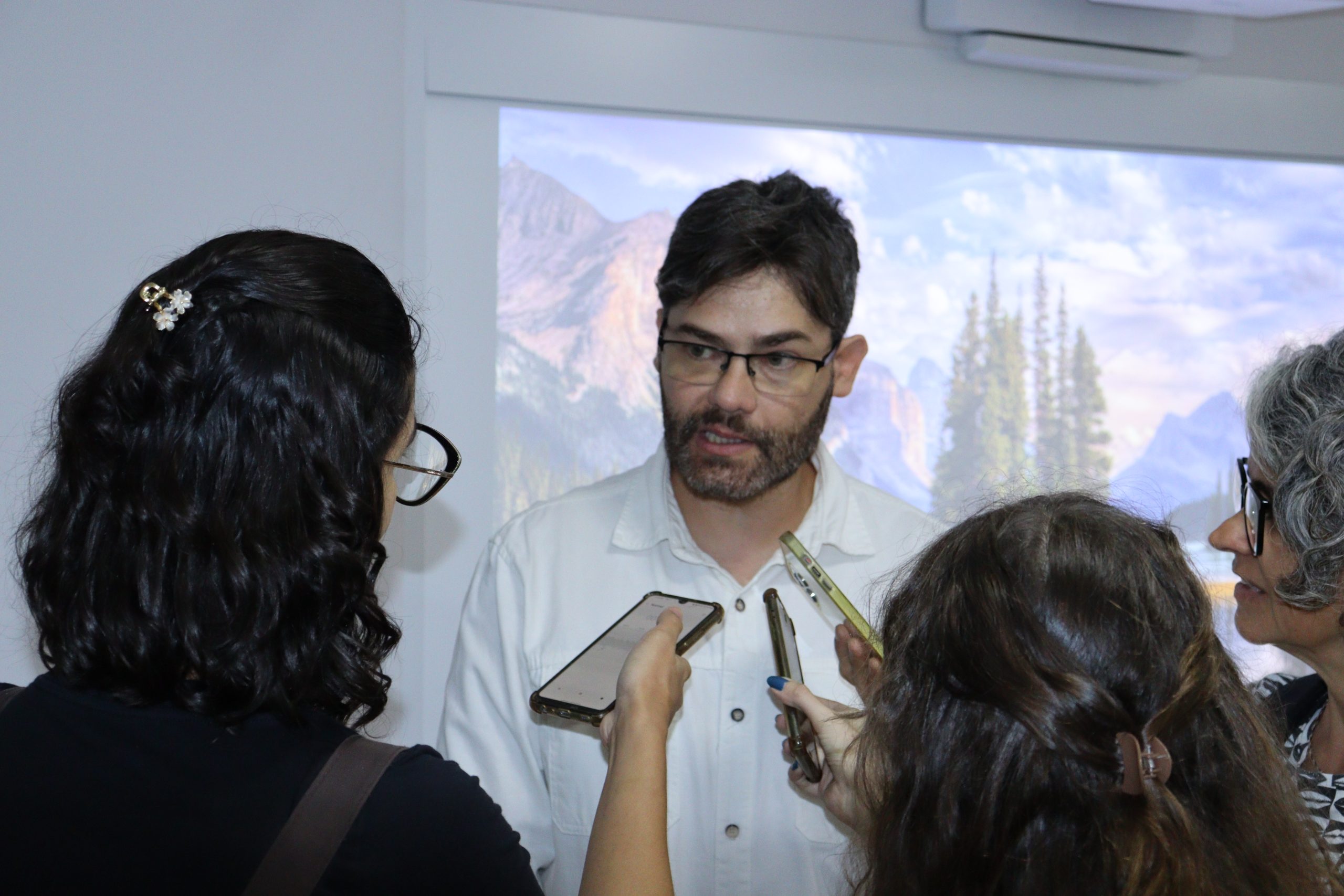 Na imagem, Cristiano Moura, gerente de programas do ChildFund Brasil, concede entrevista, após o lançamento da pesquisa. Foto: Bruno Lourenço.