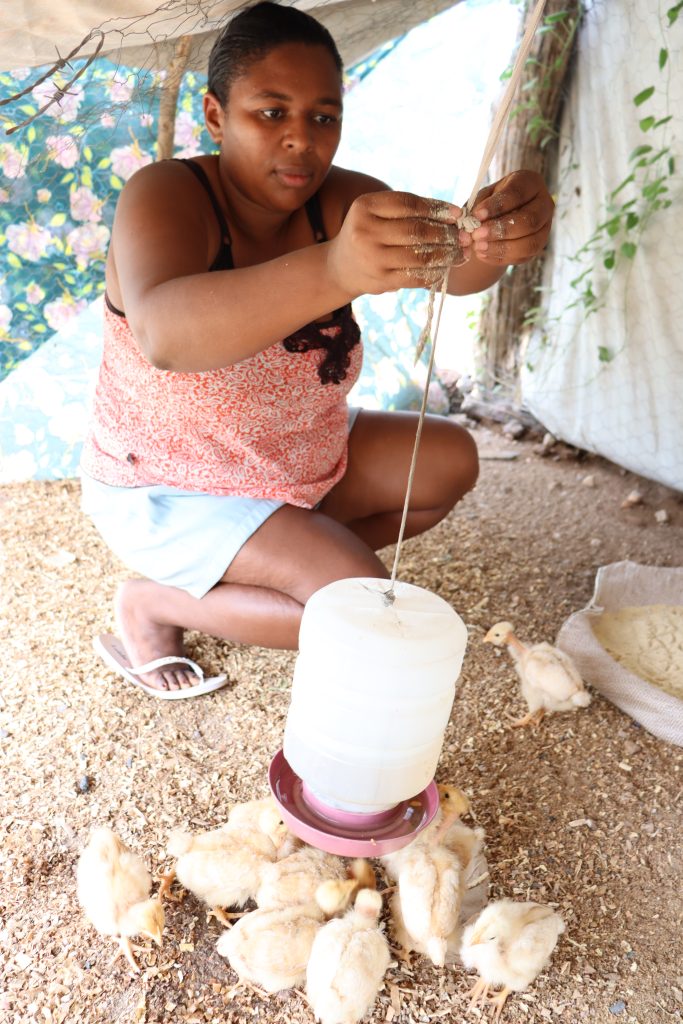 Tainá recebeu 20 pintinhos, 120 quilos de ração e tela para montar o galinheiro. Teve a ajuda dos filhos para abrigar as aves. “Participei de uma reunião na organização parceira, onde recebi informações sobre como podemos cuidar dos animais e os horários para melhor alimentá-los. A equipe também sempre nos pergunta como estão os pintinhos, enfim, tem um acompanhamento”, detalha Tainá.